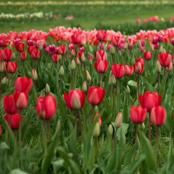 Over 3 acres of tulips in stunning varieties. Walk through rows of vibrant blooms that stretch as far as the eye can see.